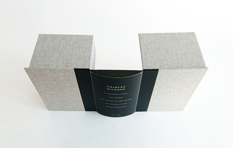 Quarter leather solander box with rounded spine. Dark blue goat, light grey cloth, panelled lining, lettering in gold.